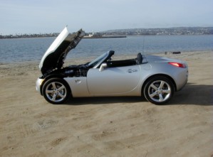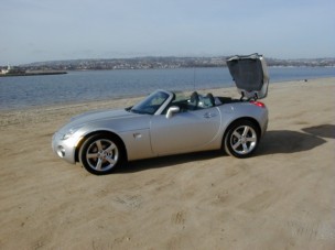 2006 Pontiac Solstice will make you say 'wow' When you first gaze upon the Pontiac Solstice, you can't help but say, "Wow!" One look at the base price of $19,915 and "Wow" comes out of your mouth again. Behind the wheel, the Solstice doesn't drive as snappy as it looks but remember, it costs less than $20,000. Hit the road and the wow comes back. I got this little sports car from my friends at North County Pontiac in Car Country Carlsbad and took it for a ride to Alpine. I had to haul a few things and had trouble finding adequate storage space. But push a button in the glove box and the convertible top pops up and then the trunk pops open to a small storage area with a rather large box-like item in the middle. I was able to put what I needed inside and the trunk lid closed with no problem. Once you push the button in the trunk, the lid pops up and you can release the top by twisting a lever mounted at the top of the windshield. Then the top folds neatly into its designed space. Go to the rear of the car, push down the trunk lid with a little bit of force and you have a very clean look. Inside the Solstice is a large instrumentation pod that houses the tachometer, speedometer and a smaller pod that houses the fuel gauge. To the right is a very simple climate control system along with the audio knobs. There are no cubbyholes for things like cell phones, which is a good thing since we're supposed to be enjoying the sports car ride with its 50/50 balance when diving into the mountain turns. In a storage box behind and between you and the passenger, there's a button that when you push it, a door opens. Just below the door are the cup holders. Push in the bar and out pops two cup holders. On the passenger side there's a third cup holder that can also be the receptacle for the smoking kit. My test vehicle didn't have the kit but I assume it is a little ashtray that sits in this receptacle. Getting behind the adjustable steering wheel, you'll immediately notice how comfortable the driver and passenger seats are. But adjust your seat back before taking off because you'll have difficulty adjusting the large knob while on the road. Sliding the seat front to rear is no problem. The top is unique looking with a pretty good fit and good visibility. There's a glass window in the rear (vs. plastic) with an optional defroster. With the top up you get gobs of headroom, but from the outside it appears to have a rather low-slung look. I did detect a little wind noise but not enough to disturb a normal conversation or the radio. The five-speed manual is mounted to a short shifter that's easy to operate. The hand brake lever is on the passenger side of the center console, which means passengers can't rest an arm in a comfortable fashion, but from the driver's side it was fine and it's all about the driver, right? In fact, the driver even gets a vanity mirror and the passenger doesn't. Under the hood is a race-proven 2.4-liter dual overhead camshaft Variable Valve Timing, in-line all aluminum four-cylinder that kicks out 177 horsepower. That's backed by a close ratio five-speed manual that drives the power to a rear wheel drive system. My test car came with a few options, such as 18-inch tire and wheel package that enhances the four-wheel sport independent suspension, power rack and pinion and Bilstein Monotube shocks. The optional fog lights were a great addition along with the power windows, mirrors and door locks, an information center and air conditioning (this last option surprised me, but it's a convertible so if you're not into A/C, you don't have to have it). My tester had a "cool silver" exterior and ebony interior. If you're thinking this car can't be safe, think again. It has front air bags for the driver and passenger, crumple zones surrounding the occupants and beams in the doors, just to name a few of its safety features. According to the dictionary, Solstice means, "Either of the two times when the sun is at its greatest distance from the celestial equator" or "A turning point," which is what I think Pontiac used. The Solstice is fun to drive and it's a real eye catcher. So if you want a fun car to drive to work or on the weekends, stop by North County Pontiac-GMC and take this rascal out for a spin. If you can't get to Car County Carlsbad, the Solstice is in all Pontiac showrooms. |
