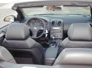 2007 Pontiac G6-GT Convertible is impressive If you like convertibles, but hate the wind noise and lack of security for your belongings, you may want to check out the Pontiac G6 convertible. The top is made of metal and operates much like the Lexus SC430, plus it's $30,000 less. My Pontiac came from North County GMC-Pontiac in Car Country Carlsbad . Not only was I impressed by the car, but also by the way I was handled when picking it up. My test car came with a beautiful "granite metallic" exterior paint and an ebony interior, which I liked a lot. Its power plant is a peppy little 3.9-liter high output (which I haven't seen since the '60s) V6, which gets 17 miles per gallon in the city and 24 miles per gallon on the open road. This engine is part of the sport package that includes 18-inch spoked alloy wheels (replacing the standard painted wheels), Stablitrak-Stability Control, dual exhaust with chrome tips for that added sportiness and automatic vs. manual A/C system. The safety equipment is pretty standard, with front airbags and crumple zones, beams in the doors, just to name a few. Side impact airbags for the driver and front passengers are optional. The Premium Package has leather appointed seats, power seats with six -way adjustments for the driver and heated seats for the passenger and driver (nice when the top is down in this chilly weather). You also get remote vehicle start, which is helpful in inclimate weather, three months of free XM Radio and (an option I don't agree with) floor mats front and rear. I feel should mats should be standard equipment. But nobody makes floor mats like the manufacturer, so I would still opt for the factory mats. You have two four-cylinder engines and six V6s to choose from. But there are only two transmissions, a four-speed electronically controlled automatic (the transmission in my G6) that can be slap shifted or a manual (only in two models of the seven available). You need to look at the GT coupe and GT sedan to get the six-speed manual transmission. If you prefer a customized car, Pontiac provides enough choices in style and color combinations. Some standard features worth mentioning are fog lights, power outside mirrors, remote keyless entry and a brake handle just to the right of a very nice center console. I like the E-Brake at the consoles as it's easy to find and use. The Monsoon sound system is the base AM/FM/six-disc CD changer with eight speakers. The steering wheel tilts and telescopes, and the radio can be controlled from the leather-wrapped steering wheel. I really like the G6, especially the retractable solid roof. When the roof is up, the interior is dead quiet. Plus, there's a trunk for storing items. The 2007 Pontiac G6 Convertible GT is very well equipped, even at its base price of $28,565. This mildly loaded G6 hit the cash register at $32,250, which isn't bad for vehicle with a lot of style and performance. Stop by North County GMC-Pontiac to take one of these G6s out for a spin. You might be pleasantly surprised like I was! |