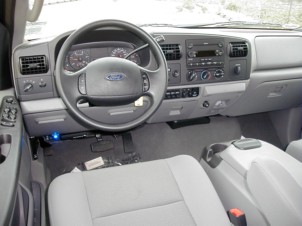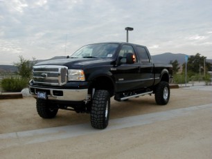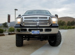 except that it can be driven on the streets in total comfort. OK, it bounces a little, but that's what comes from lifting a stock truck. Still, this lifted truck doesn't ride like the ones of yesterday. Other than the occasional bounce, this truck really rides well and the driver has the feeling of total control -unlike the old lifts. This truck started out as a stock 2006 Ford F250 Super Duty 4X4 crew cab XLT wide body styleside with a 6.0-liter V8 Power Stroke Turbo diesel and a torque shift five-speed automatic transmission. That's a mouthful, but does it perform. This truck can haul, tow or pull just about anything out there. Since it's a diesel, you're probably thinking that it must be really noisy and smelly - but not with today's diesel technology. You can still hear the diesel when it's idling but that's part of the magic of owning a lifted truck. On the open road, you hardly hear it. Plus, Ford has done wonders with soundproofing the cabin area. My test truck had a black exterior with a medium flint (gray) cloth interior. There's minimal chrome except on the massive chrome grill. It also has full-length running boards to help front and rear occupants get into the truck. This is already a pretty high truck to get into, but lifted it can be a real challenge. Ford provides a few things to grab onto, such as the steering wheel or grab bar - but those are really out of reach unless you're six-foot plus. Once you're inside the view is great, but be careful because you could easily run over that little Toyota MR2 that cuts in front of you. But stopping is a snap with the tire and wheel package Heller Ford installed with the lift. The Pro Comp Xterrain 37X13/50R18 LT off-road tires are mounted on a set of beautiful alloy wheels that look as if they've been polished. The Fabtech lift looks really good, with custom trailing arms, double shocks with an elongated coil spring up front and a single shock system in the rear, which gives this Super Duty a level ride. There are a lot of lifted trucks out there with their noses in the air, causing grief out on the roads with their blinding headlights. When you see a truck with the nose higher than the rear, it's because the lift isn't done correctly, no matter what the driver says. |